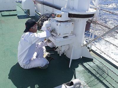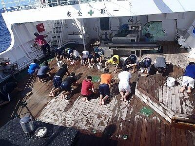強い貿易風が吹いています。 大きくローリング(横揺れ)しながらの錆び打ち作業ですが実習生は乗組員指導の下、船酔いもなく一生懸命に取り組んでいます。