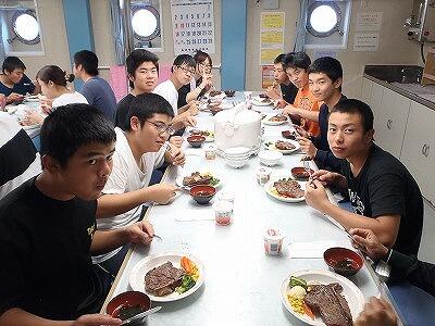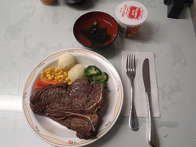 昨夜は実習生待望のTボーンステーキが提供され、フォーク・ナイフでアメリカンサイズと格闘していました。