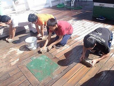 実習生は今日からストーン磨り(石による木甲板を磨く)作業に取りかかりました。