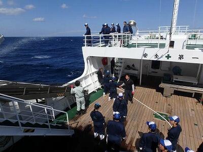 日本の最東端に接近、絶海の孤島の風景に実習生は感慨深げでした。今日も順調に父島に向かっています。