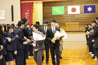 本日、平成28年度離任式が体育館で行われました。1・2年生はもちろん、卒業式を終えた3年生や数年前の卒業生も来てくれました。