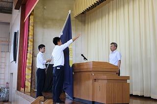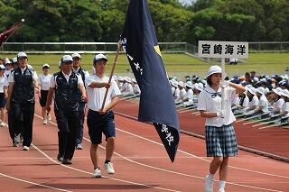入場行進の旗手を務めたのは、空手道部の俵君。組手で九州大会出場を目指しています。