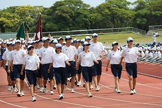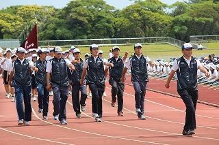 教員の入場行進。生徒に負けないくらいの元気な掛け声でした。