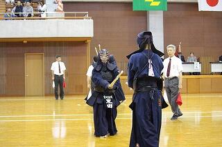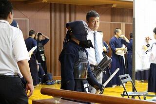 県武道館で行われた剣道の個人戦。試合前に顧問にアドバイスを受ける黒田君