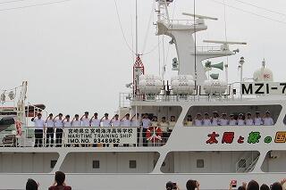 実習生代表の阪元君は、「船酔いなどつらいこともあるかもしれませんが、40人で力を合わせて乗り越えたい」と挨拶をしました。神戸では宮崎県人会関西支部との交流や企業視察が予定されており、生徒も楽しみにしています。