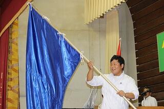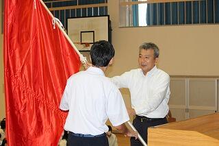 教頭先生から団旗を授与された青団団長・山本くん。他の団と違って人数が少ないですが、強いまとまりが期待できます!