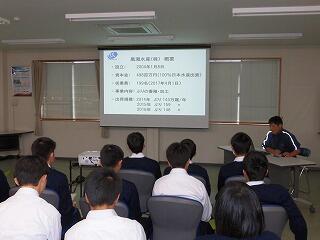 会社の概要について説明していただいています。ブリ養殖についてのビデオに生徒達は釘付けでした。