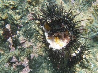 見つけたウニを、棒でつぶします。うまく割ることができました。