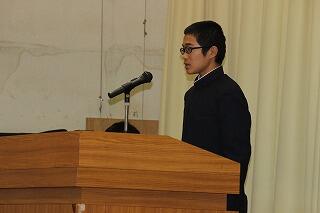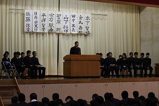 昨日の選挙で選ばれた9名。新生徒会長の金丸君は「公約通り、日本一の学校にしていくので、協力をお願いします」と力強く挨拶をしました。