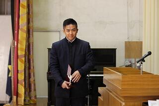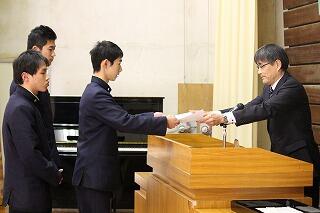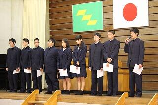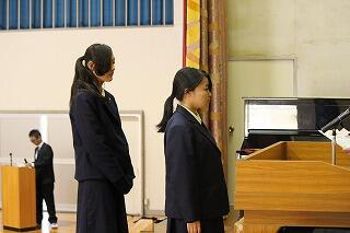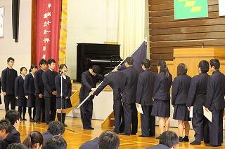 旧生徒会役員から生徒会旗の引き継ぎです。