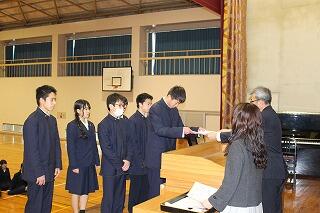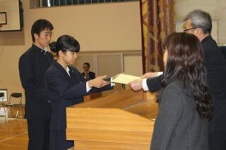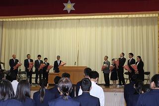 その後の表彰式では、1ヶ年皆勤・精勤、文字力テスト高得点者、多読賞、部活動成績優秀者、英語スピーチコンテスト入賞者などの生徒が表彰されました。