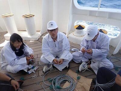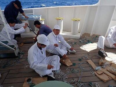 同じく漁具作成の様子。船酔いに負けず作業をします。
