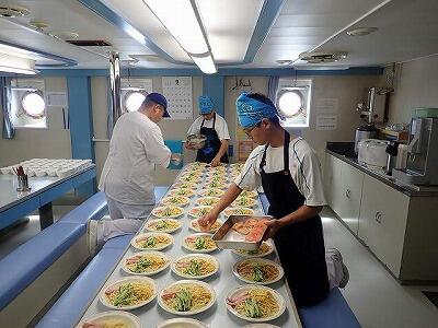 チキン南蛮に冷やし中華など船内の食事は豪華・食欲旺盛!!