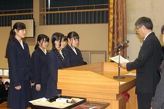 表彰式も行われました。写真は2018年度海の宝アカデミックコンテストの受賞者4人です。他にも1年生大会、新人戦等での運動部の活躍も表彰されました。