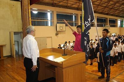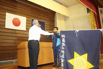 団旗授与には陸上部の開地くん、選手代表先生にはバドミントン部の長田くんです。