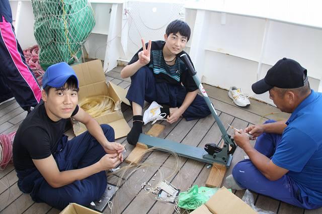 乗組員の方に指導してもらいながら、漁具を作っています。