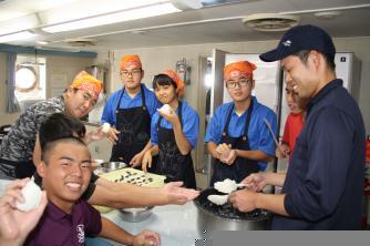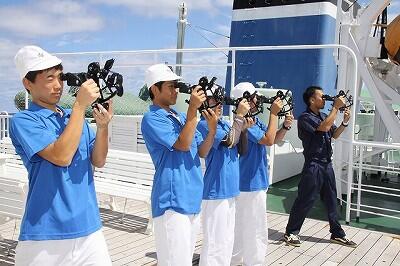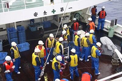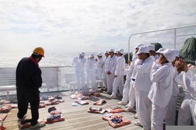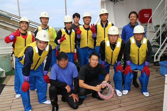 実習生は初めての作業に戸惑いながら、乗組員の指導を受け真剣な表情で