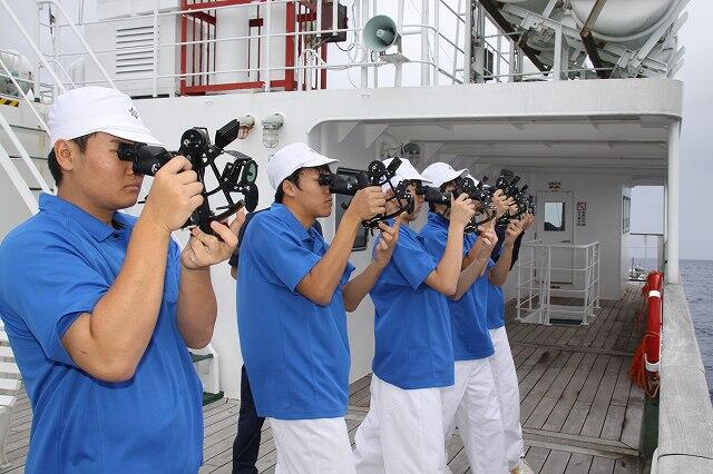 六分儀を使っての天測です。太陽の角度を測り自船の位置を計算してだします。