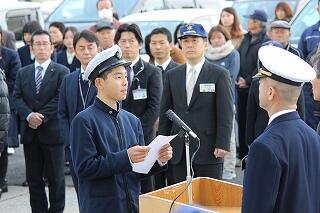 「仲間を信頼して73日間の実習を乗り切ってきます」と挨拶をする実習生代表の児玉君