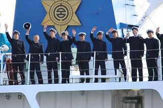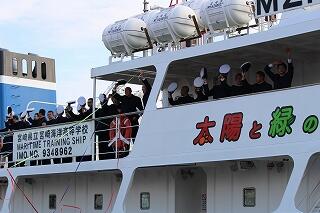 本日、2年B組生徒40名、指導教官2名、乗組員20名が長期乗船実習に出港いたしました。実習生の健康と安全航海を祈願して、全校生徒で見送りました。