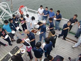 試食会はプロムナードデッキで行いました。班ごとにメニューで苦労した点など発表しました。おいしい夕食でした!!