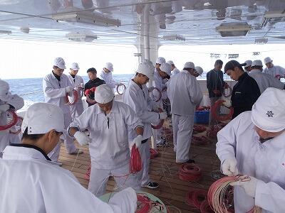 実習生は操業実習に向け投縄や冷凍処理方法など、担当の乗組員から説明を受け