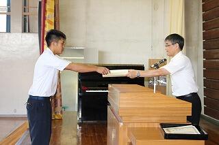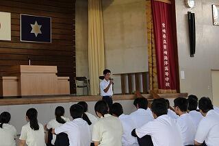 始業式では、校長先生より「3R(Reset,Renew,Restart)」の話があり、生徒会長の金丸君からは全校生徒に向けて「一人一人の行動に責任を持ち、海洋高校に在学していることに誇りを持てるようにしましょう」と語りかけ、生徒は真剣に聞いていました。