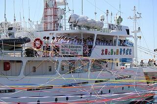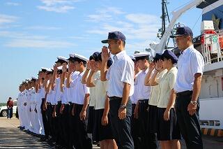 台風一過の青空ものと、2年B組24名(男子20名,女子4名)を見送る出港式が行われました。