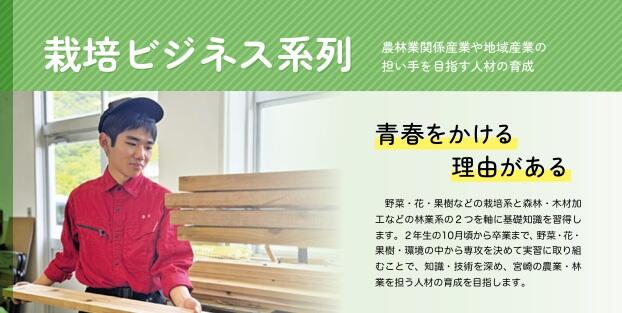 野菜・花・果樹などの栽培系と、森林・木材加工などの林業系の2つを軸に基礎知識を習得します。2年生の10月頃から卒業まで、野菜・花・果樹・環境の中から専攻を決めて実習に取り組むことで知識・技術を深め、宮崎の農業・林業を担う人材の育成を目指します。