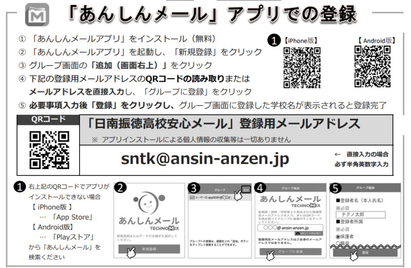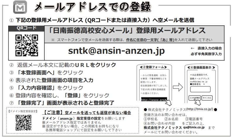本校では提供情報の分かりやすさと、生徒・保護者の更なる利便性向上のため、令和5年度より一斉メール配信システムを「日南振徳高校安心メール」に変更しました。