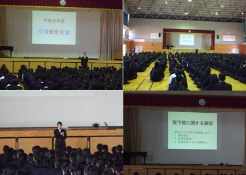 交通教室 投稿日時 : 2017/04/13 モデレータ 本日は、交通教室が行われました。昨年、実際に交通事故が起こった場所でのシミュレーションなどをプレゼンテーションして、全校生徒で交通マナーなどについて考えました。今年一年間、登下校中を始めとして、交通安全には気をつけましょう。