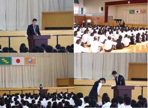 九州総体壮行式 投稿日時 : 2017/06/02 モデレータ 県高校総体を勝ちあがって、九州総体、南九州総体へ出場する選手達の壮行式が行われました。今回は、ヨット部、陸上部、弓道部、レスリング部の生徒たちが上位大会へ勝ちあがっています。インターハイ出場が決まっている選手もいますが、九州大会上位めざして頑張ってください。