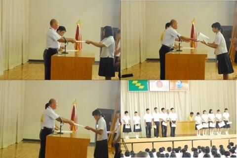 生徒会役員解任式、任命式 投稿日時 : 2016/09/01 モデレータ 昨日までが任期でした、第6期生徒会役員解任式と、1学期末の校内選挙にて選ばれました、第7期生徒会役員の任命式が行われました。今期生徒会役員のテーマは「轟」ということで、これから1年間学校を牽引していってくれることを期待致します。
