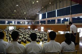 生徒会役員改選 投稿日時 : 2019/07/05 広報02 本日、5・6限目は生徒会役員改選が行われました。 全校生徒の代表・中心となり、学教行事等を盛り上げて行きます♬ 1・2年生合わせて15名の立候補者が出揃いました!!結果はどうなるのか!?開票までドキドキしますね(>_<)まず始めに、主権者教育を行いました(^_^)衆議院・参議院の人数や、選挙についての話を聞きます。立候補者が、全校生徒に向けて演説を行います(^o^)どんなことに力を入れていきたいか、どんな学校にしたいかなど、各自の思いを伝えます。立候補者の話をしっかり聞きます♬投票時は話をせず、自分の意思表示をしっかり行います!!