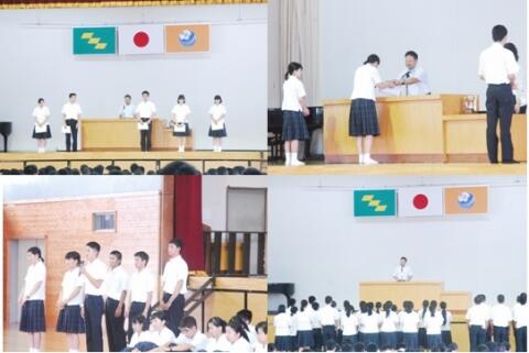 今月から始まる、夏の高校野球大会に出場する野球部を始め、来月開催の全国高校総体に出場するヨット部、レスリング部。また、全国大会へ出場する放送部、ワープロ部の健闘を祈り、壮行式が行われました。