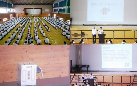 生徒会役員改選を前に、日南市選挙管理委員会から講師を招いて、全校生徒による主権者教育が行われました。