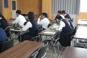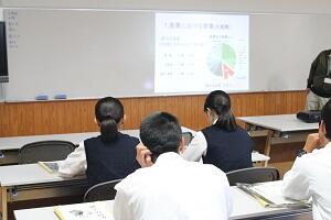 日南市の施策についての講話 投稿日時 : 2018/10/16 広報02 本日、5・6時限目に「日南市の施策につての講話」が行われました。外部から講師の方々をお招きし、マーケティング・観光・農政・健康・総合戦略の各分野の施策についてお話をしていただきました。生徒達にとって、自分たちの研究テーマについてのヒントを得ることのできる良い機会になったのではないでしょうか。
