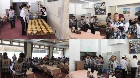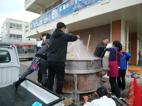 全校生徒が2杯ずつ食べても余裕がありそうな大鍋にて、暖かい豚汁の配食があります。