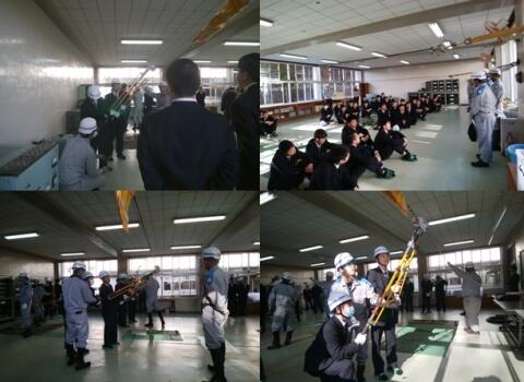 実習室に高圧電線を張り、間接作業によって、絶縁の被覆を剥ぐ体験をさせてもらいました。