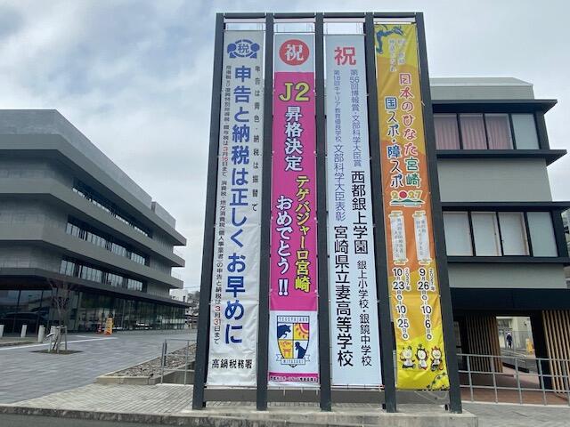 【祝・文部科学大臣表彰】西都市役所に懸垂幕を掲示していただきました!