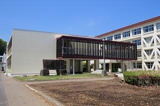 入り口は1階の西側・東側と、2階の東側です。2階東側は、事務室前の玄関より渡り廊下でつながっています。