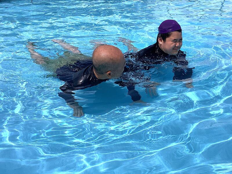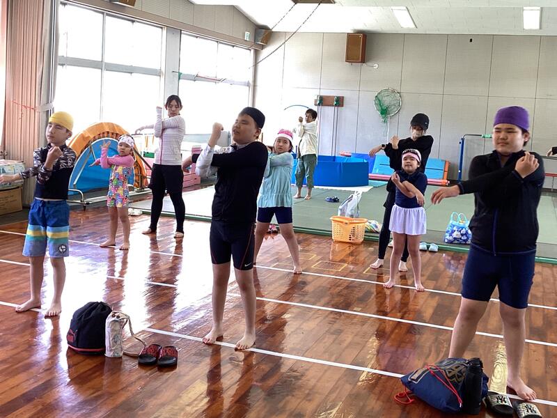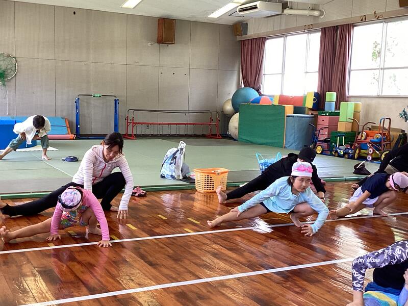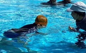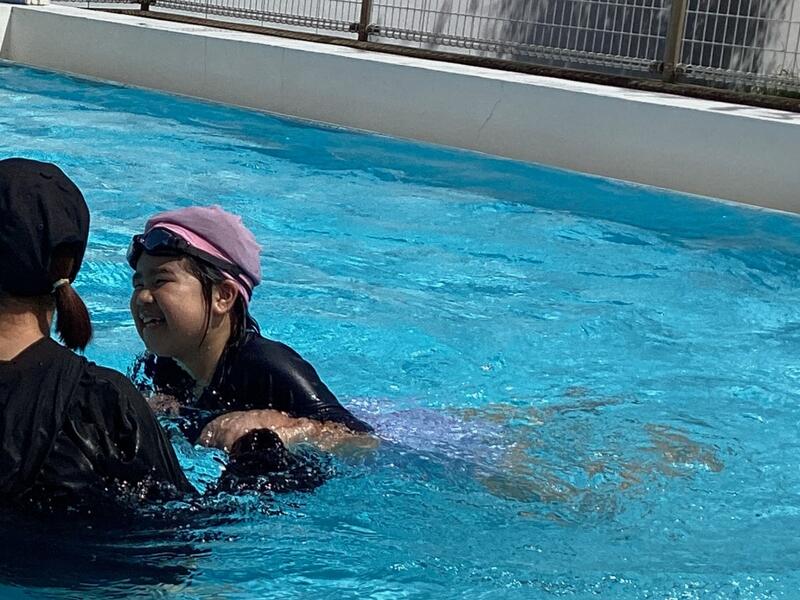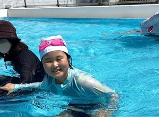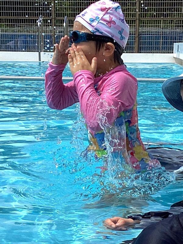 プレイルームで入念に準備体操を行ったあと、プールへ移動。シャワーを浴び、いよいよ入水です。まだまだ厳しい日中の陽ざしの中、歓声をあげながら存分に水の感触を楽しみました。