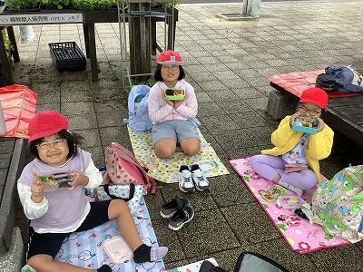 その後、萩の台公園へ。「よ~し!みんなでお弁当を食べて遊ぶぞ~!」と気合い十分に到着したのはいいものの・・・。ピューッと吹く冷たい風と、ザーッと強まる雨・・・。残念ですが、東屋でお弁当だけ楽しんで学校に戻りました。