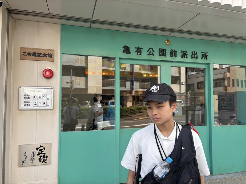また、社会科好きの1年生は、皇居周辺散策の後、「こち亀記念館」を見学しています。「派出所」の前で撮った写真を送ってきてくれました。