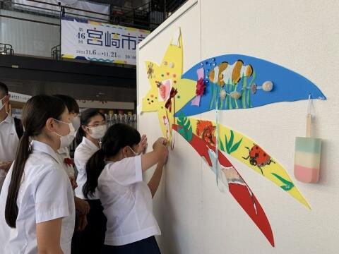 1()の午後、みやざきアートセンターの「太陽の広間」にて、作品展示を行いました。作品は、アートフェスティバル会場のシンボルとして、本校普通科5名と宮崎北高校の美術部生徒8名とで共同制作したものです。