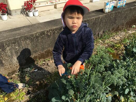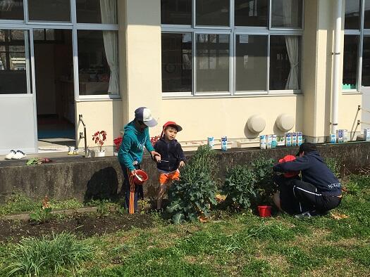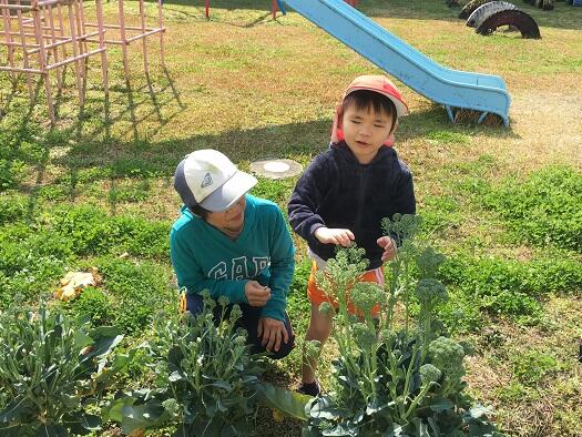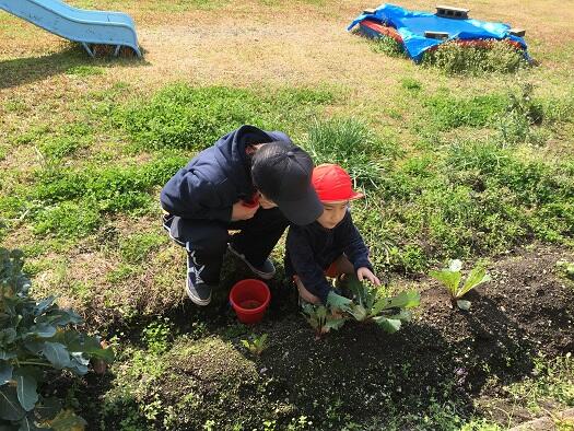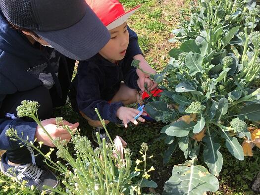 今日はお天気も良く春の陽気です。幼稚部の子どもたちがカブとブロッコリーの収穫をしました。自分たちで畝を作り、種をまいたものが大きくなりました。カブとブロッコリーも収穫できそうです。両手で形や大きさを確認しながら収穫していました。「土がついてる!」「まるいね!」「たくさんある!」いろいろな言葉が子どもたちの口から出てきます。地についた体験が地についた芯のある言葉になっていきます。