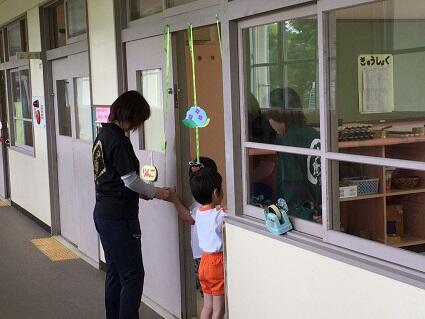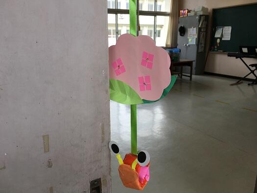 本校幼稚部の教室入り口には季節ごとに制作した風物がのれんとして飾ってあります。6月に入りカタツムリとあじさいが飾られました。子どもたちはそれぞれに触りながら、「目がついてる!」、「ぐるぐるになってる!」と嬉しそうに話していました。日常の中に季節があり、触って確かめられる工夫にとても感心すると共に嬉しくなりました。