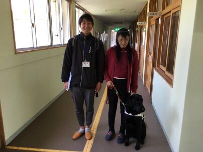 本校の職員が盲導犬の訓練を行っています。先週まで大阪の日本ライトハウス盲導犬訓練所で訓練を行っていましたが、いよいよ宮崎での実地訓練に入りました。今日は訓練士の方と自宅から学校までの訓練を行いました。学校では職員のみんなが歓迎していました。もうすぐ本校の大切な一員になります。