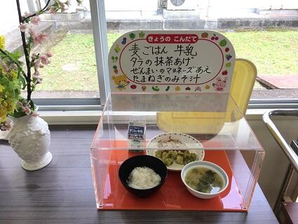 今日の給食は春を味わう献立でした。本校の給食は、在学中に「季節の料理」をはじめ「宮崎の郷土料理」、「日本の郷土料理」、そして、「世界の料理」を味わわせたいという栄養教諭の先生の思いと厨房の方々の協力で献立がたてられています。今日は春を感じる季節の献立でした。「タラの抹茶揚げ」、「ぜんまいのマヨネーズあえ」、「新タマネギのみそ汁」です。食で季節や日本、世界を知るという本校ならではの食育です。子どもたちも職員もおいしくいただきました。