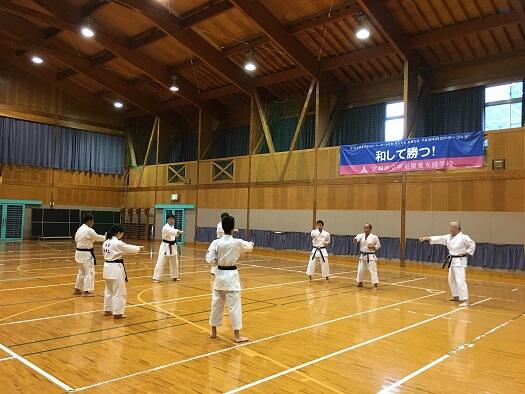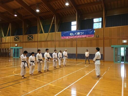 6月2日に宮崎県障がい者空手道協会の設立総会が本校で行われました。宮崎県空手道連盟副会長の深水館長と田岡館長のお二人が顧問となり、本校理療科主任の小山教諭が事務局長となりました。現在の会員は、本校卒業生で今年度空手道世界大会視覚障がい部門で1位となった成人男子と本校高等部男子生徒の2名です。今年は年4回の練習を行います。今後、さらに障がいの枠を広げながら、空手道の普及と発展を図っていきます。設立総会の後は門下生との合同練習が行われ、基本の動きの練習や形の演舞が行われました。生涯スポーツへの扉がまた一つ開かれました。